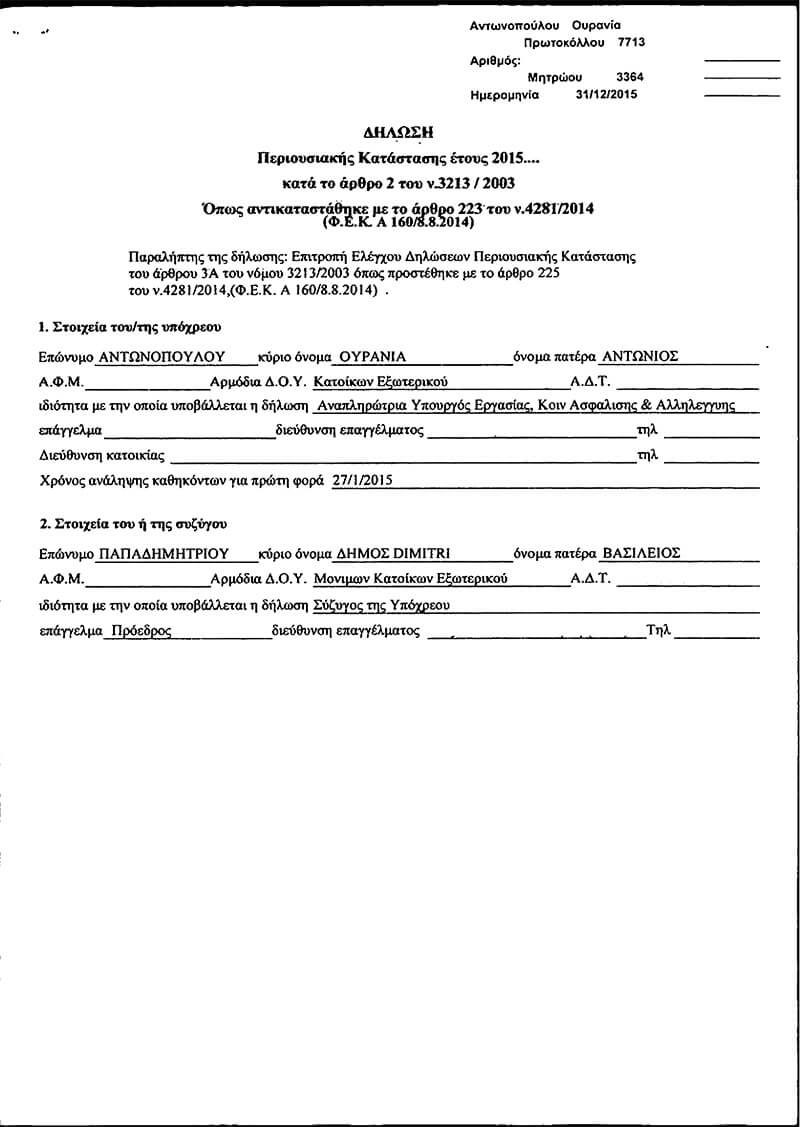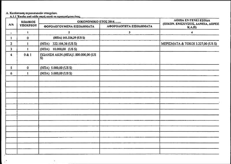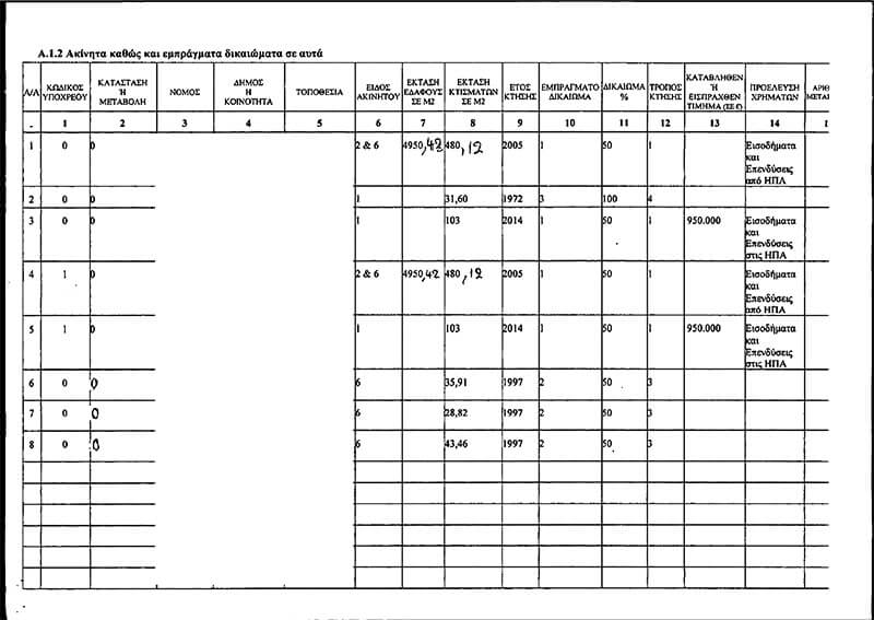 Σύμφωνα με το «πόθεν έσχες» που κατέθεσε η κυρία Αντωνοπούλου και αποτυπώνει την περιουσιακή κατάσταση του ζεύγους για το 2014 προκύπτουν τα εξής: