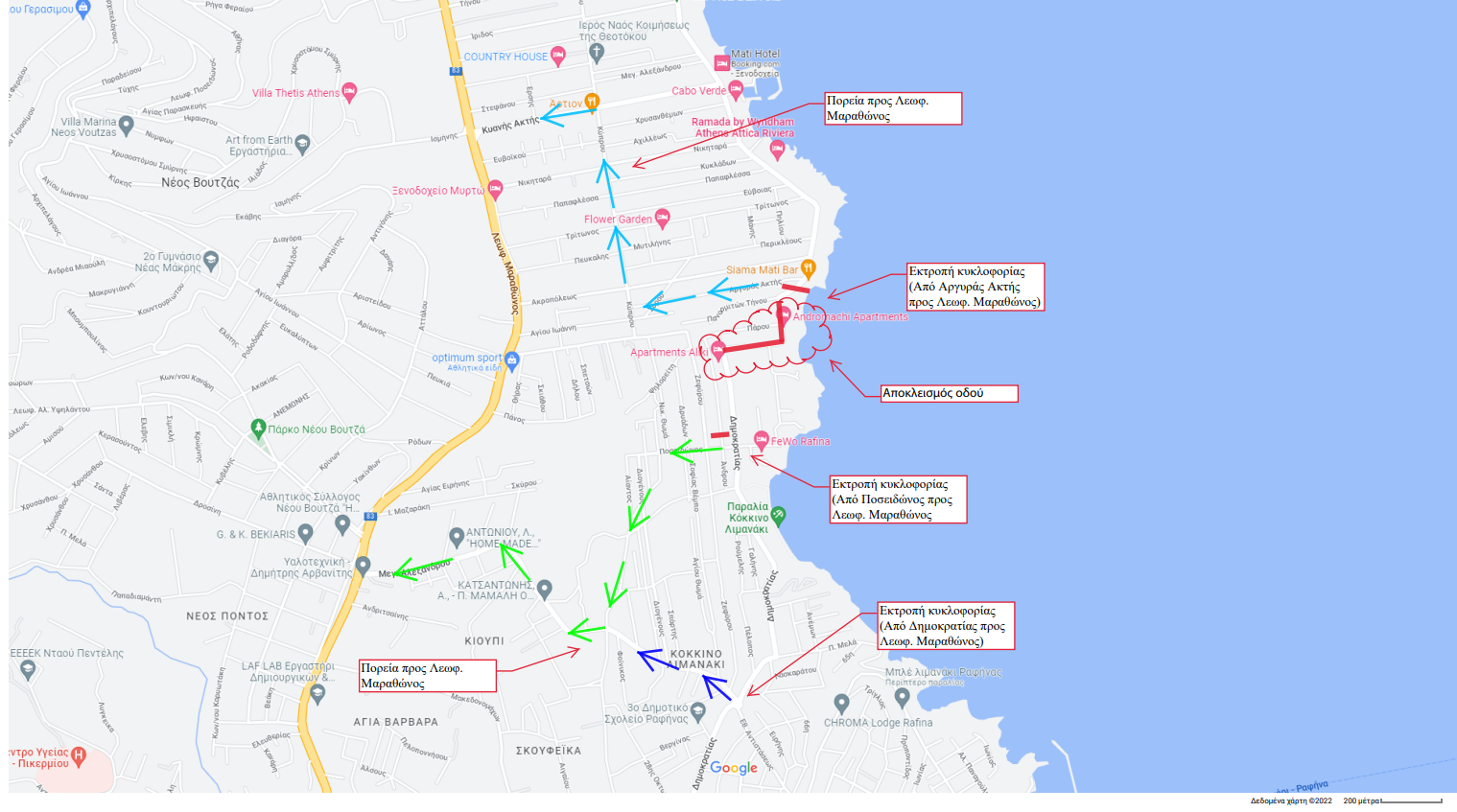 • Από Φλέμινγκ, δεξιά Δημοκρατίας, κυκλικά τον κόμβο στη συμβολή με την οδό Εθν. Αντιστάσεως (πριν το Κόκκινο λιμανάκι), δεξιά Ίλιδος, συνέχεια Αργιθέας, συνέχεια Μεγ. Αλεξάνδρου, δεξιά Λ. Μαραθώνος, δεξιά Κυανής Ακτής, αριστερά Λ. Ποσειδώνος, συνέχεια ως έχει.