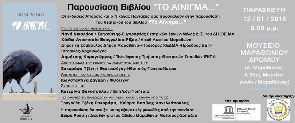 Οι Εκδόσεις «Άπαρσις» και ο Νικόλας Πανταζής σας προσκαλούν στην παρουσίαση του θεατρικού του βιβλίου «Το Αίνιγμα…», την Παρασκευή 12 Ιανουαρίου, στις 18:00, στο Μουσείο Μαραθωνίου Δρόμου στον Μαραθώνα