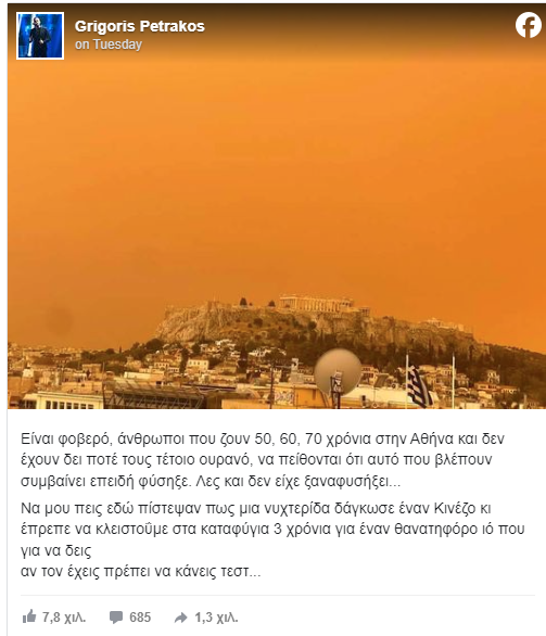 Και ο Γρηγόρης Πετράκος θεωρεί «φοβερό» από ανθρώπους που ζουν 50, 60, 70 χρόνια στην Αθήνα να μην έχουν δει ποτέ τους τέτοιο ουρανό και να πείθονται ότι αυτό που βλέπουν συμβαίνει επειδή φύσηξε.