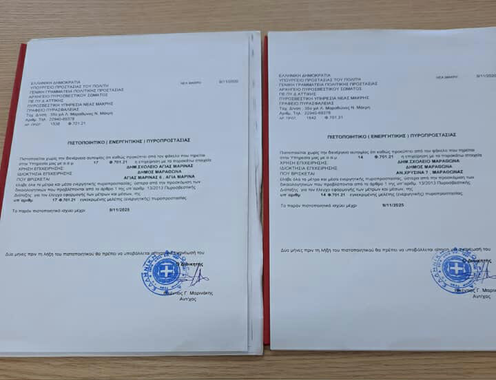 Ολοκληρώθηκαν οι διαδικασίες, για την εξασφάλιση πιστοποιητικών Ενεργητικής Πυροπροστασίας στα Δημοτικά Σχολεία της Αγίας Μαρίνας και της Κοινότητας Μαραθώνα.