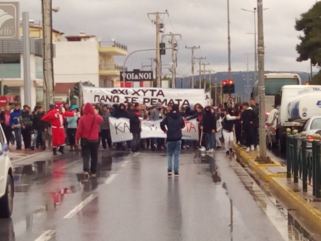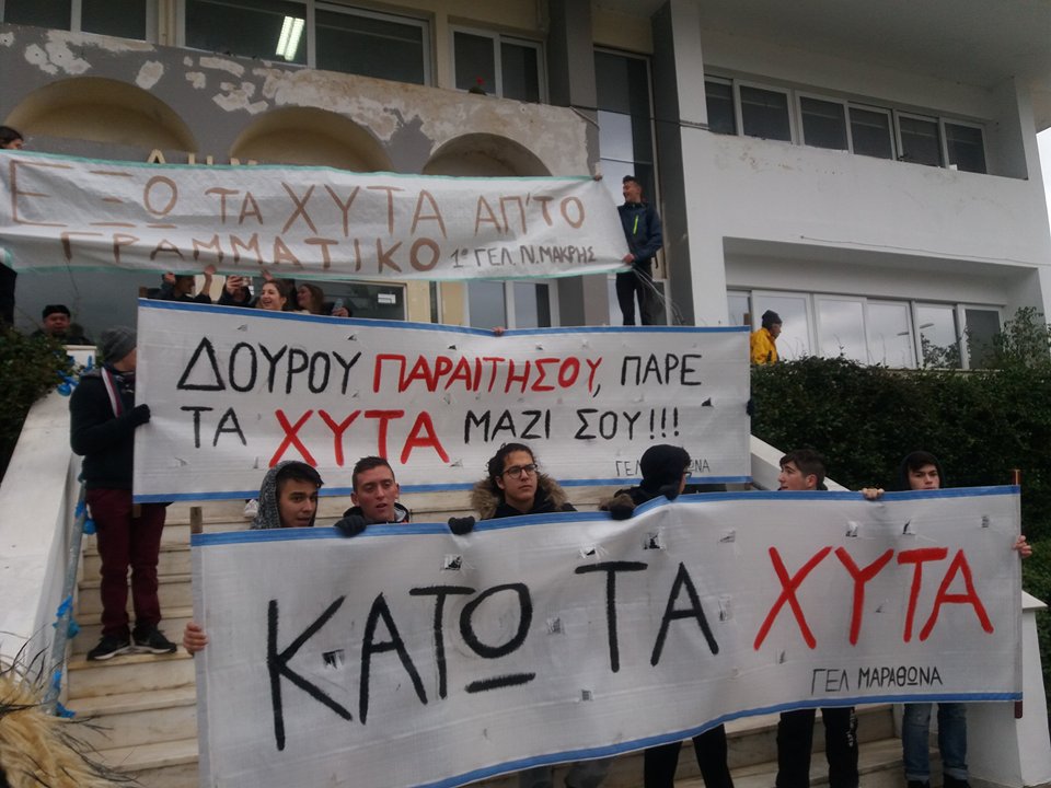 Οι μαθητές, παρά τις αντίξοες συνθήκες περπάτησαν από την πλατεία Ηρώων στον Μαραθώνα έως το Δημαρχείο της Νέας Μάκρης. Φτάνοντας στο Δημαρχείο ανάψαν καπνογόνα, ενώ στη συνέχεια πέταξαν… αυγά και πορτοκάλια στο κτήριο του Δημαρχείου. Τα παιδιά σήκωσαν πανό τα οποία έγραφαν: «ΔΟΥΡΟΥ ΠΑΡΑΙΤΗΣΟΥ ΠΑΡΕ ΤΑ ΧΥTΑ ΜΑΖΙ ΣΟΥ» κι άλλα τέτοια συνθήματα.