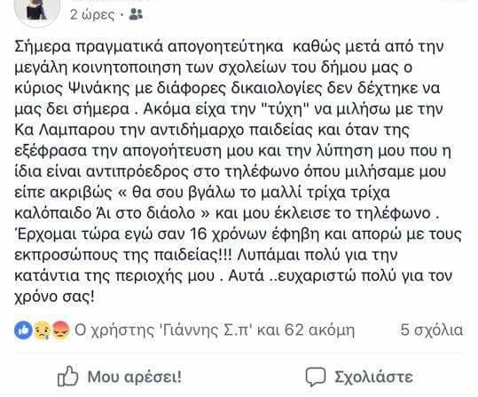Μια μαθήτρια του Λυκείου της Νέας Μάκρης, η οποία επικοινώνησε με τη κα Λαμπαρού, δημοσίευσε στη σελίδα της στο facebook κείμενο στο οποίο αναφέρει ότι προσβλήθηκε από την Αντιδήμαρχο. Διαβάστε το κείμενο: