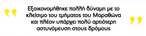 Κι όμως, με τα νέα δεδομένα, εξοικονομήθηκε δύναμη και στην περιοχή έβγαιναν δύο περιπολικά, κάτι που είχε πάρα πολλά χρόνια να συμβεί. Κι αν γίνει και νέα αναδιάρθρωση -που θεωρώ ότι δε θα αργήσει- τα αποτελέσματα πιστεύω ότι θα είναι ακόμα καλύτερα. Ενδεικτικά αναφέρω ότι πριν την αναδιάρθρωση στην περιοχή του δήμου Μαραθώνα, τα δύο Αστυνομικά Τμήματα είχαν καταφέρει το δεύτερο εξάμηνο του 2016 να διαθέσουν συνολικά μόλις 116 περιπολίες.