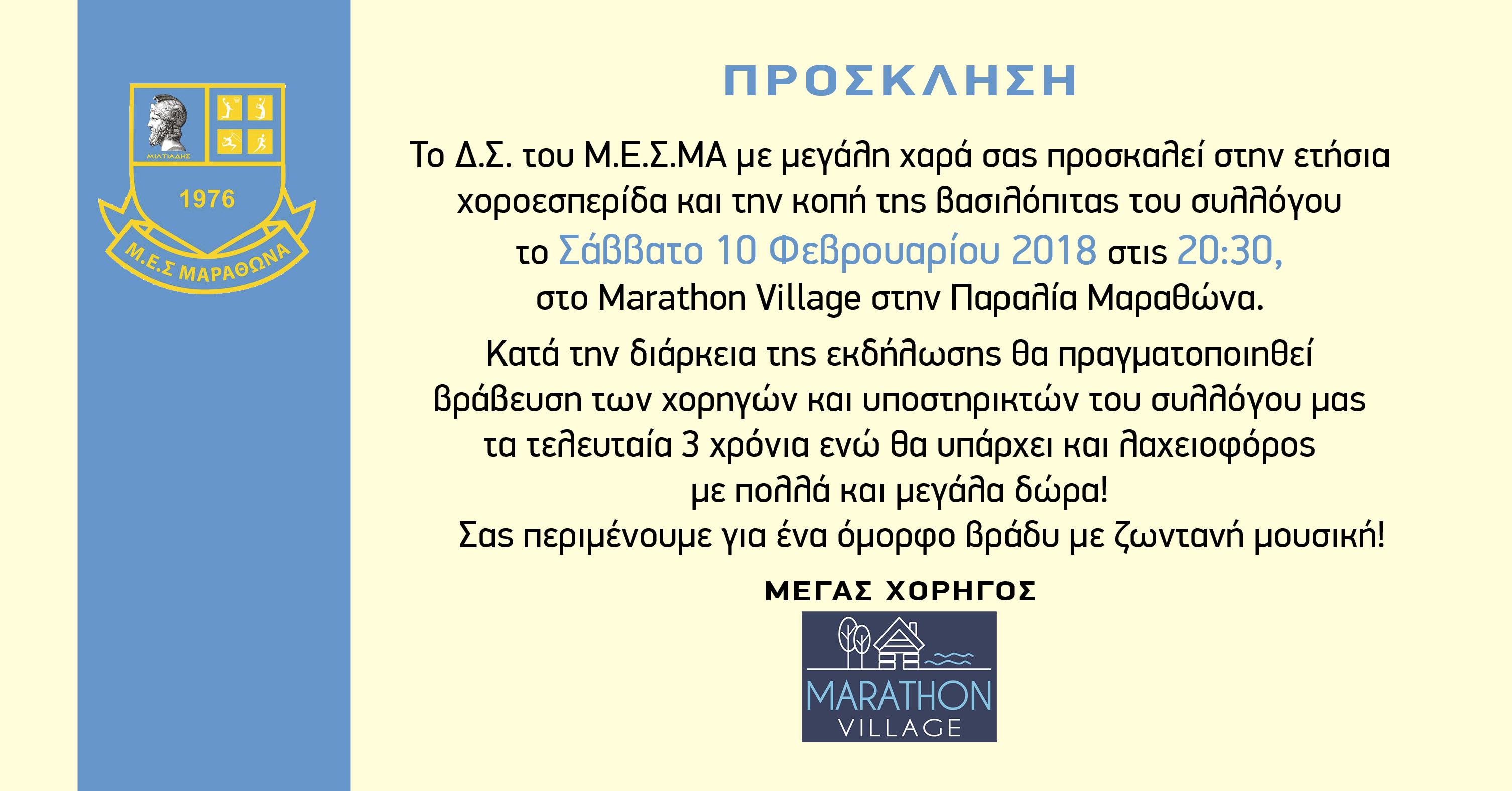 Ο Σύλλογος του Μ.Ε.Σ.ΜΑ. σας προσκαλεί στην κοπή της βασιλόπιτάς του και στην ετήσια χοροεσπερίδα, το Σάββατο 10 Φεβρουαρίου στις 20:30, στο Marathon Village στην Παραλία Μαραθώνα, με ζωντανή μουσική!