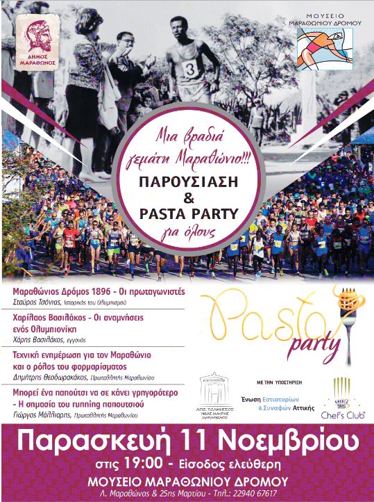 Ο Τελμησσός, ο σύλλογος Μαραθωνοδρόμων Μαραθώνος καλεί όλους εσάς τους Μαραθωνοδρόμους και φίλους του Μαραθωνίου Δρόμου την Παρασκευή 11 Νοεμβρίου 2022, στις 19:00 να παρακολουθήσετε ξεχωριστές ομιλίες και να παραβρεθείτε στο πρώτο Pasta Party που διοργανώνεται στο Μουσείο Μαραθωνίου Δρόμου!