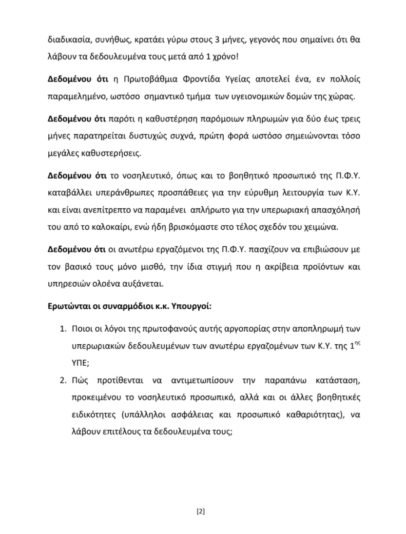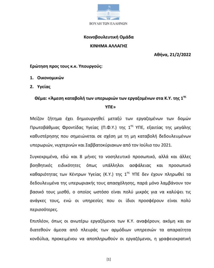Μετά από την παρέμβαση του Λάζαρου Καραούλη προς τον τομέα υγείας του ΠΑΣΟΚ- Κίνημα Αλλαγής για τις απλήρωτες υπερωρίες 9 μηνών των νοσηλευτριών και βοηθητικού προσωπικού των Κέντρων Υγείας της 1ης ΥΠΕ (17/2), αλλά και τις πιέσεις του Περιφερειακού Συμβούλου Γιάννη Σμέρου και Αν. Γραμματέα Υγείας Σωτήρη Ζώτου, ο επικεφαλής της κοινοβουλευτικής ομάδας του ΚΙΝΑΛ Μιχάλης Κατρίνης κατέθεσε σήμερα στην Βουλή, ερώτηση προς τους Υπουργούς Υγείας και Οικονομικών, με θέμα την “Άμεση καταβολή των υπερωριών των εργαζομένων στα Κέντρα Υγείας της 1ης ΥΠΕ” μεταξύ των οποίων και της Ανατολικής Αττικής.