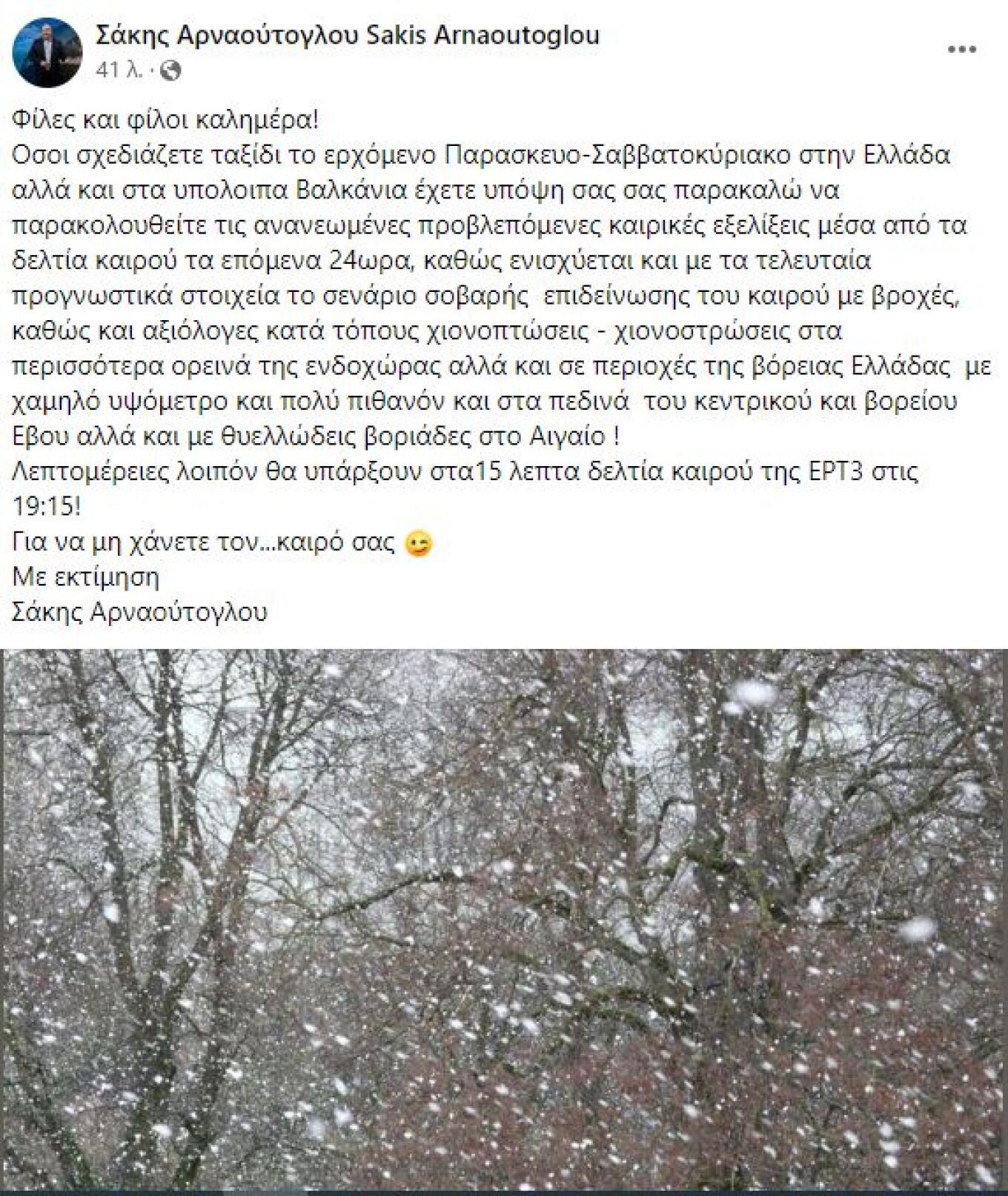 Στο ίδιο κλίμα ευθυγραμμίζεται σε ανάρτησή του στο Facebook o Σάκης Αρναούτογλου, ο οποίος, μάλιστα, απευθύνει προειδοποίηση για όλους όσοι σχεδιάζουν ταξίδι Παρασκευή, Σάββατο και Κυριακή στην Ελλάδα και στα υπόλοιπα Βαλκάνια.