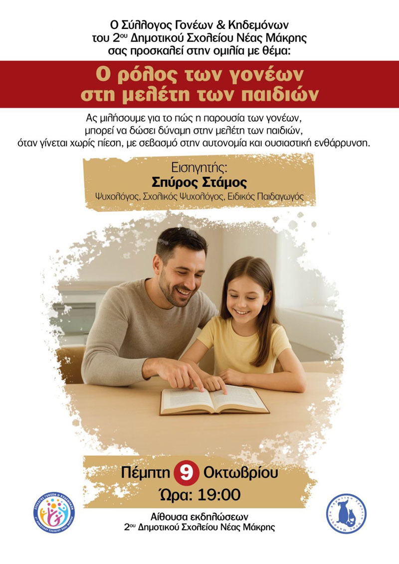 Νέα συζήτηση για τους γονείς με θέμα τον ρόλο των γονέων στη μελέτη των παιδιών, οργανώνει την ερχόμενη Πέμπτη το 2ο Δημοτικό Σχολείο Νέας Μάκρης.