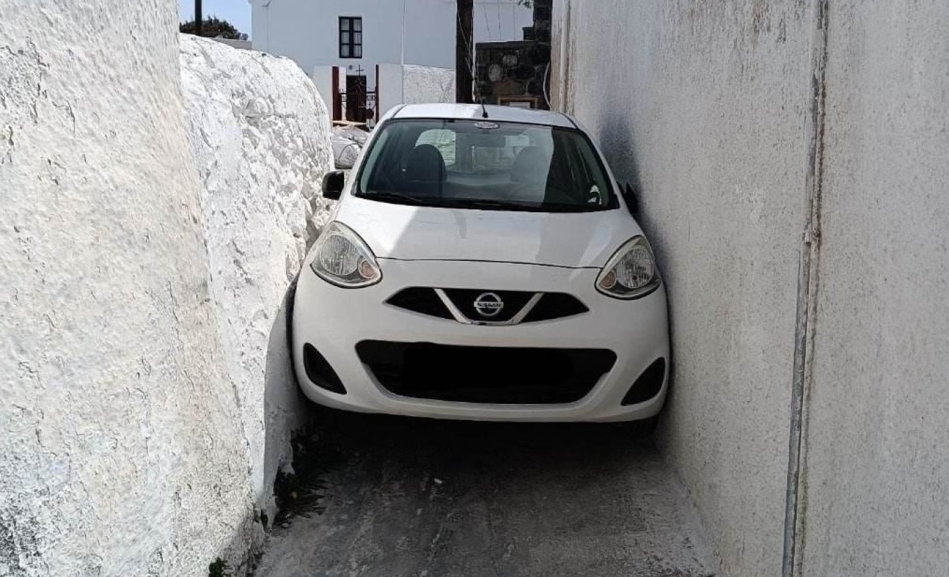 Αυτό φαίνεται δεν το γνώριζε ο οδηγός ενός ενοικιαζόμενου αυτοκινήτου που, όπως ανακοίνωσαν οι αρχές με τη σχετική φωτογραφία, σφήνωσε σε ένα στενό δρομάκι στη Σαντορίνη.
