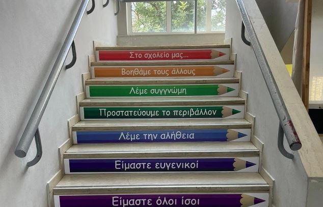 Από σήμερα, Δευτέρα, τα σκαλοπάτια στο εσωτερικό του 1ου Δημοτικού Νέας Μάκρης έχουν μηνύματα. Κάθε σκαλοπάτι και διαφορετικό μήνυμα όπως «είμαστε όλοι ίσιοι», «λέμε όχι στη βία», «λέμε συγγνώμη», «δεν κοροϊδεύουμε».