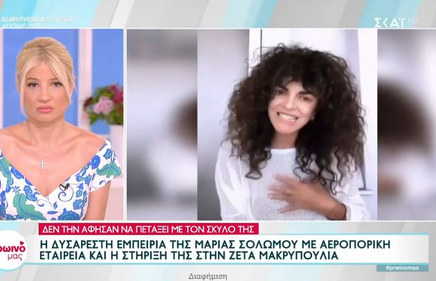 «Την προηγούμενη εβδομάδα πέταξα για Θεσσαλονίκη και μπήκα ηλεκτρονικά και έκλεισα ένα εισιτήριο για εμένα και τον σκύλο μου. Όταν έκλεισα το εισιτήριο, μου είπαν ότι δεν μπορώ να κάνω online check-in, φαντάστηκα ότι είναι γιατί πρέπει να ζυγίσουν τον σκύλο. Λέω οκ θα πάω λίγο νωρίτερα. Η μόνη υποσημείωση που βγήκε είναι, πέρα από τα λεφτά που μου πήραν για το πήγαινε – έλα του σκυλιού, είναι να έχω ταυτότητα ή διαβατήριο. Μου είπαν ότι πρέπει να έχω το βιβλιάριο του σκυλιού» είπε αρχικά η Μαρία Σολωμού.