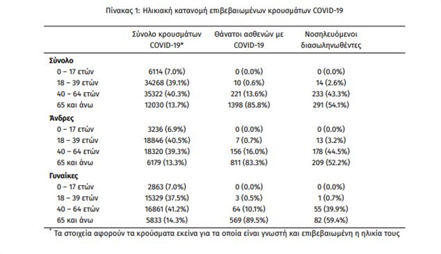 Τέλος, έχουμε 103 ακόμα καταγεγραμμένους θανάτους και 1630 θανάτους συνολικά στη χώρα. 647 (39.7%) γυναίκες και οι υπόλοιποι άνδρες. Η διάμεση ηλικία των θανόντων συμπολιτών μας ήταν τα 80 έτη και το 97.0% είχε κάποιο υποκείμενο νόσημα ή/και ηλικία 70 ετών και άνω.