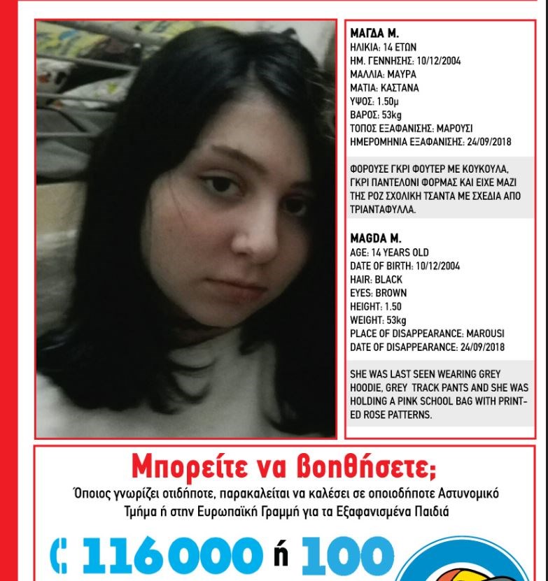 Συναγερμός έχει σημάνει για την εξαφάνιση της 14χρονης Μάγδας από το Μαρούσι.