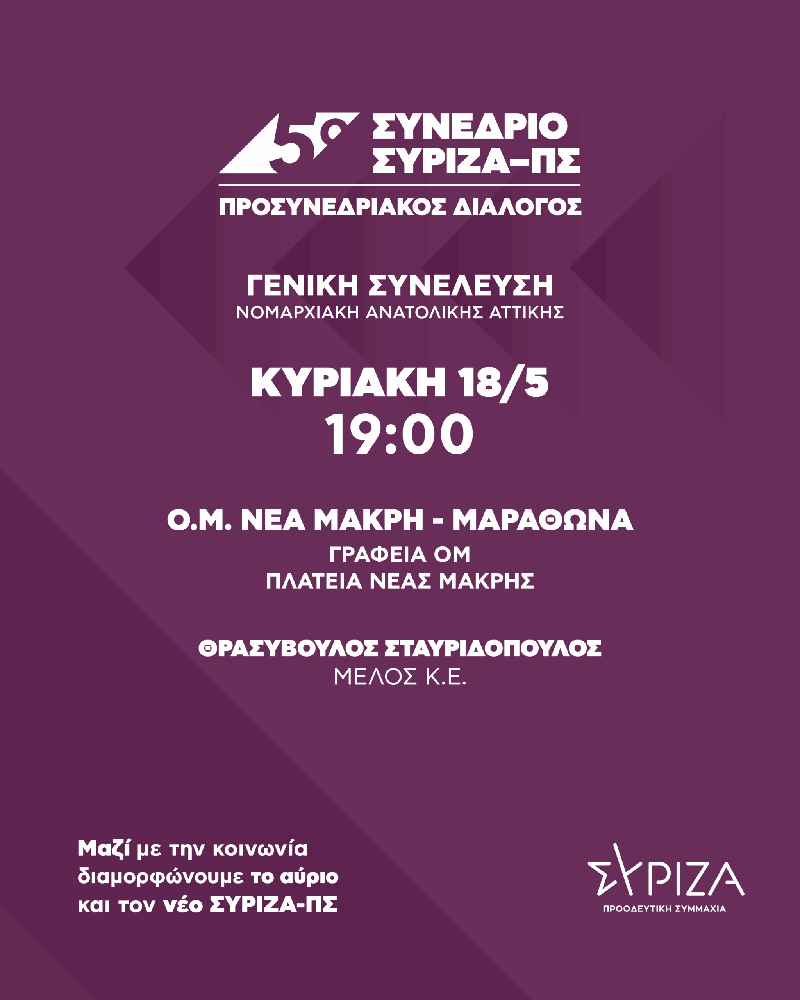Η γενική συνέλευση θα ξεκινήσει στις 19.00 και θα φιλοξενηθεί στα γραφεία της Ο.Μ. ΣΥΡΙΖΑ Νέας Μάκρης – Μαραθώνα, στην πλατεία της Νέας Μάκρης.