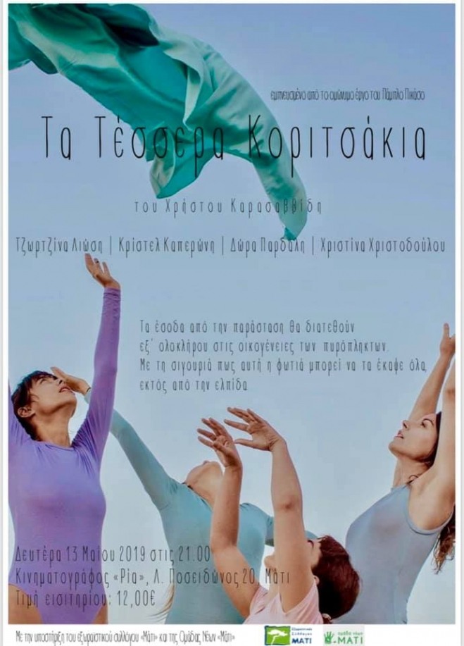 Mετά από μια επιτυχημένη σεζόν, o Χρήστος Καρασαββίδης φέρνει τη θεατρική παράσταση «Τα 4 κοριτσάκια» στο Μάτι. Τη Δευτέρα 13 Μαΐου στις 21:00, στο θερινό Σινέ Ρία (Λεωφ. Ποσειδώνος 20) θα ανέβει για μία και μόνο φορά, με σκοπό να υποστηρίξει πυρόπληκτες οικογένειες από τη φονική πυρκαγιά της 23ης Ιουλίου.