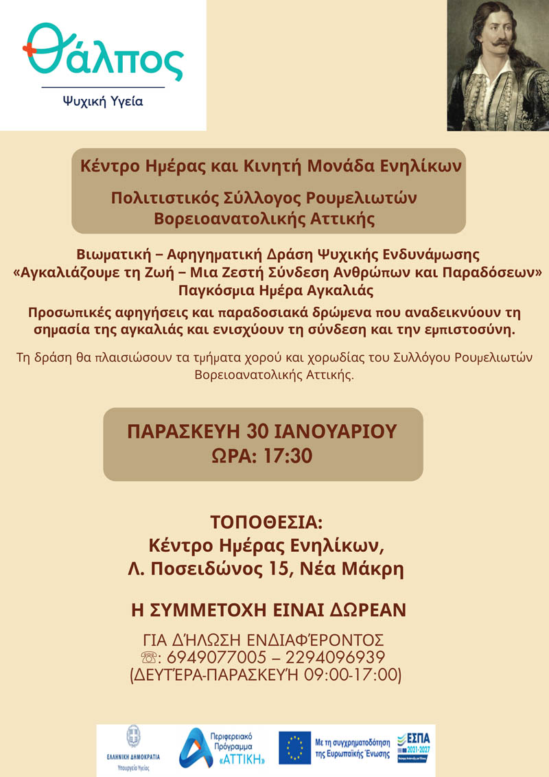 Το Κέντρο Ημέρας και η Κινητή Μονάδα Ενηλίκων ΘΑΛΠΟΣ ΨΥΧΙΚΗ ΥΓΕΙΑ, σε συνεργασία με τον Πολιτιστικό Σύλλογο Ρουμελιωτών Βορειοανατολικής Αττικής, διοργανώνουν μια μοναδική βιωματική και αφηγηματική δράση ψυχικής ενδυνάμωσης με τίτλο: