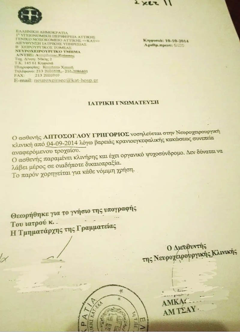 Ήταν όμως σε θέση να υπογράψει; Ένα ντοκουμέντο «βόμβα» από τον διευθυντή της Νευροχειρουργικής Κλινικής του ΚΑΤ, με ημερομηνία 10 Οκτωβρίου 2014, είναι κατηγορηματικό: