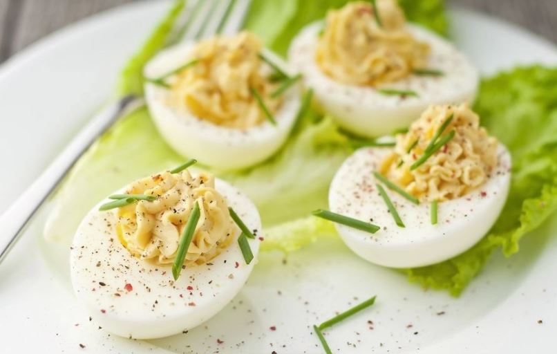 Γεμιστά πικάντικα αβγά: Κόψτε στη μέση 8 αβγά και βγάλτε τους κρόκους προσεκτικά χωρίς να σπάσουν τα ασπράδια. Βάλτε σε ένα μπολ τους κρόκους, 3 κουταλιές μαγιονέζα, 1 κουταλάκι του γλυκού σκόνη μουστάρδα, λίγες σταγόνες γούστερ σος και 1 ψιλοκομμένο φρέσκο κρεμμυδάκι. Ανακατέψτε το μείγμα και μοιράστε το στα μισά ασπράδια με ένα μικρό κουτάλι ή με το κορνέ ζαχαροπλαστικής. Κόψτε λεπτές λωρίδες από αλλαντικά (προσούτο, σαλάμι ή ζαμπόν) και βάλτε τις επάνω στα αβγά. Γαρνίρετε με φυλλαράκια μαϊντανού.