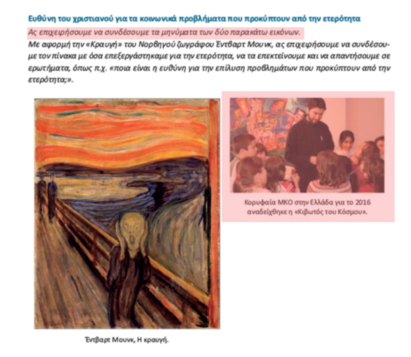 Στο βιβλίο ΧΡΙΣΤΙΑΝΙΣΜΟΣ ΚΑΙ ΘΡΗΣΚΕΥΜΑΤΑ, της Β’ Λυκείου, στη σελίδα 76, αφαιρείται η πρόταση: «Ας επιχειρήσουμε να συνδέσουμε τα μηνύματα των δύο παρακάτω εικόνων».
