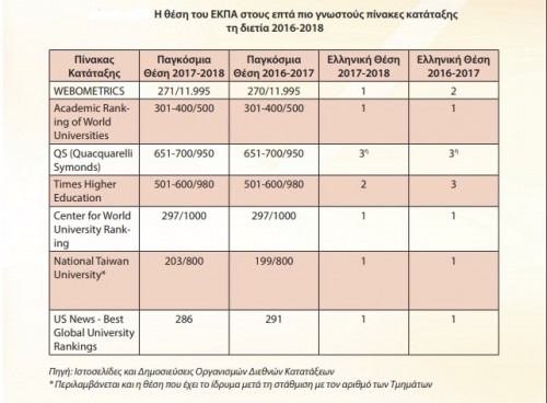 Ανάμεσα στα καλύτερα πανεπιστήμια του κόσμου βρίσκεται η θέση του Εθνικού και Καποδιστριακού Πανεπιστημίου Αθηνών, αφού στους τέσσερις από τους επτά πιο γνωστούς πίνακες κατάταξης, κατατάσσεται στα 300 καλύτερα πανεπιστήμια διεθνώς.