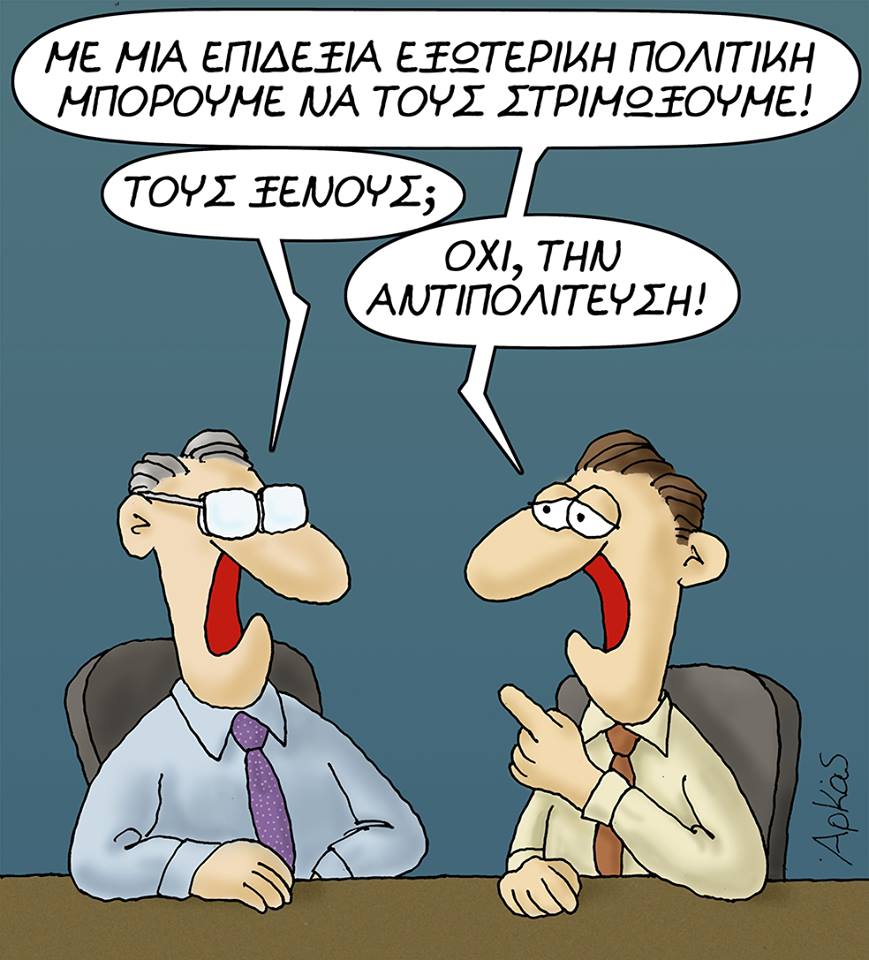 Δύο άνδρες σε διάλογο: «Με μια επιδέξια εξωτερική πολιτική μπορούμε να τους στριμώξουμε» λέει ο ένας. «Τους ξένους;» αναρωτιέται ο συνομιλητής του. «Όχι, την αντιπολίτευση» απαντά ο πρώτος .