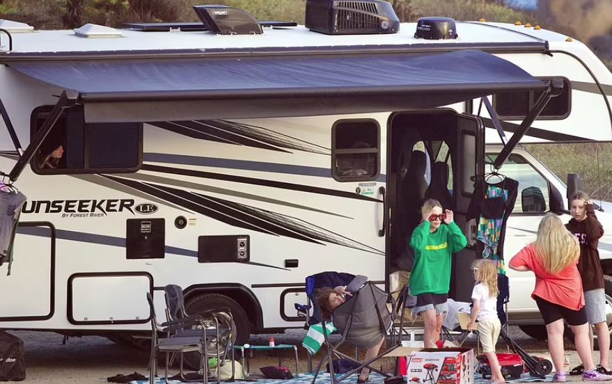Η οικογένεια ξεφόρτωσε πολλά αντικείμενα από το όχημα, όπως καρέκλες για κάμπινγκ, ψυγείο, σόμπα, τραπέζι – ακόμα και ένα μεγάλο χαλί.