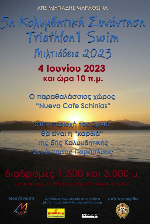 O Α.Π.Σ Μιλτιάδης Μαραθώνα με τη συμπαράσταση του Πανελληνίου Ομίλου Μαραθώνιας Κολύμβησης «Α.Λ.Σ» και τη Llifeguard HELLAS, διοργανώνει Αθλητική συνάντηση στις 4 Ιουνίου 2023, με την ονομασία Triathlon1 Swim Μιλτιάδεια 2023 στον Όρμο του Σχινιά.