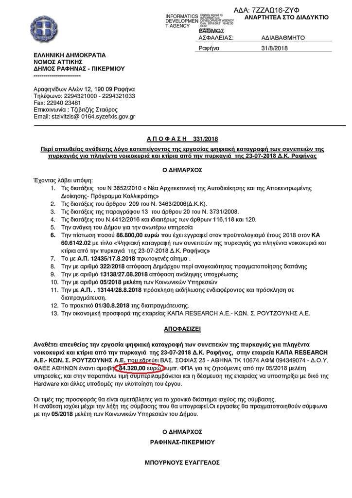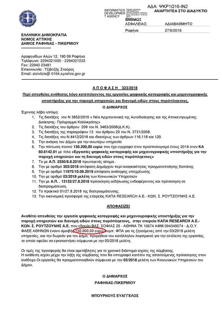 Ο επικεφαλής της Δύναμης Ανάπτυξης, κ. Ανδρέας Βασιλόπουλος, επιτέθηκε στον Δήμαρχο Ραφήνας-Πικερμίου και τον κατηγόρησε ευθέως ότι δίνει, με δύο απευθείας αναθέσεις, ποσά εκατοντάδων χιλιάδων ευρώ από τα χρήματα που είναι για τους πυρόπληκτους σε μία εταιρεία δημοσκοπήσεων και επικοινωνίας.