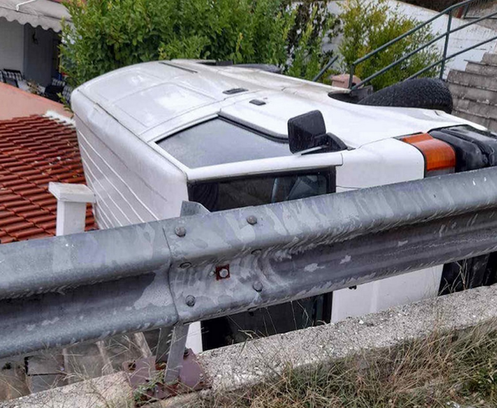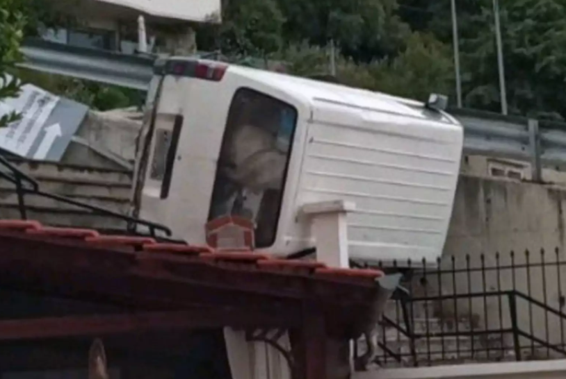 Ένα μικρό φορτηγό κινούμενο στον δρόμο του Παληού και στο ύψος Γλάστρες εξετράπη της πορείας του και αφού προσέκρουσε σε προστατευτική μπάρα “προσγειώθηκε” στην στέγη ενός σπιτιού από την κάτω μεριά του δρόμου.