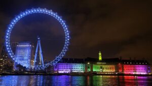 Το London Eye στις όχθες του ποταμού Τάμεση, η γέφυρα του Λονδίνου, τα συντριβάνια στην Πλατεία Τραφάλγκαρ, όλα δείχνουν πολύ όμορφα με το μπλε φωτισμό τους, αλλά αυτό το μπλε δεν είναι εορταστικό.