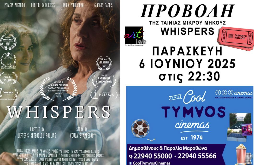 Την ταινία μικρού μήκους του Λευτέρη Κετέογλου Πούλια Whispers (Φωνές) σε σενάριο της Βούλας Σταμπέλου από τη Νέα Μάκρη, θα προβάλει απόψε με ελεύθερη είσοδο ο κινηματογράφος Cool Tymvos στην Παραλία Μαραθώνα.