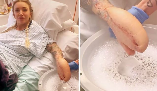 Μία γυναίκα στη Μεγάλη Βρετανία μπήκε για μία εγχείρηση αφαίρεσης πέτρας στα νεφρά και όταν ξύπνησε αντίκρισε το χέρι της να μοιάζει με… κεφάλι καρχαρία. Το περιστατικό συνέβη στην πόλη Peterborough όταν οι γιατροί έραψαν το ίδιο το χέρι της γυναίκας μέσα στο στομάχι της για να καταπολεμήσουν μια λοίμωξη. Ένα βίντεο που καταγράφει το πώς έγινε εν τέλει το χέρι έχει σήμερα πάνω από 75 εκατομμύρια προβολές στο TikTok.
