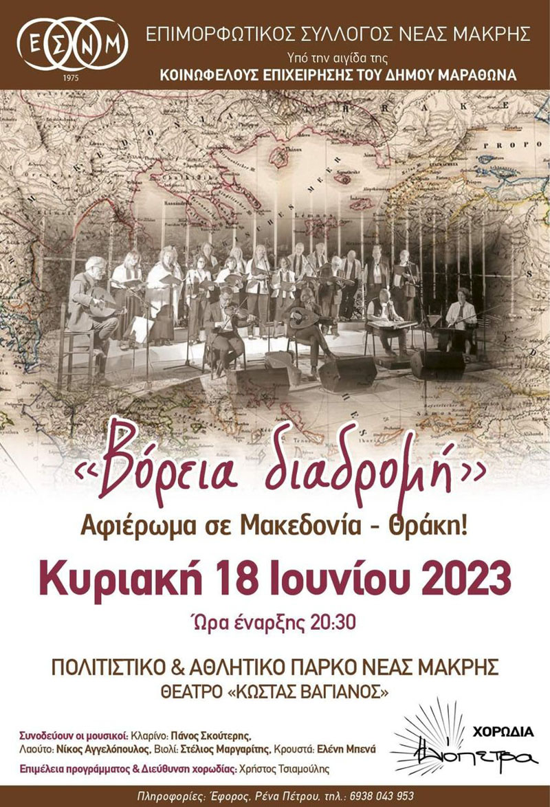 Αυτή την Κυριακή 18 Ιουνίου 2023 (8.30μμ) στο θέατρο “Κώστας Βαγιανός” του Πολιτιστικού & Αθλητικού Πάρκου Νέας Μάκρης, η χορωδία του Επιμορφωτικού Συλλόγου Νέας Μάκρης “Ηλιόπετρα”, την οποία διευθύνει ο εξαιρετικός Χρήστος Τσιαμούλης, παρουσιάζει τη δουλειά ενός χρόνου σε μία συναυλία αφιερωμένη σε Μακεδονία και Θράκη!