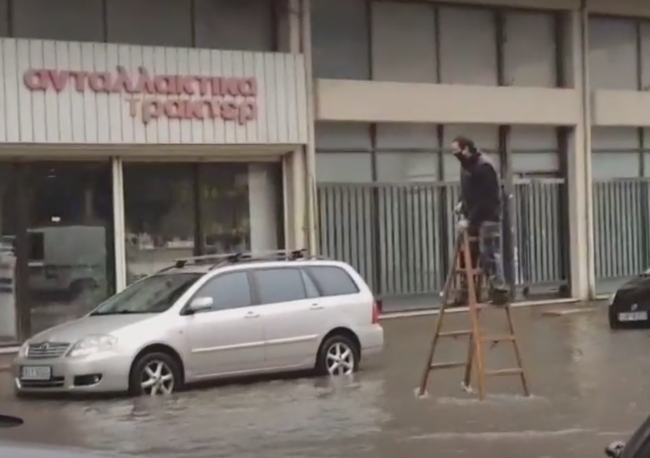Πήρε μια σκάλα και σαν… ξυλοπόδαρος διέσχισε τον πλημμυρισμένο δρόμο για να φτάσει και να καταφέρει να μπει στο αυτοκίνητό του.
