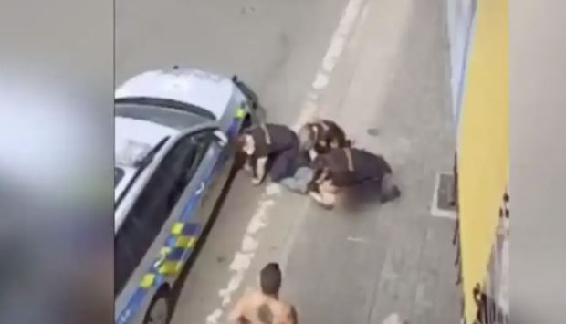 Πλάνα από βίντεο δείχνουν αστυνομικό να γονατίζει στον λαιμό άντρα από τη Ρουμανία, που στη συνέχεια πέθανε, μέσα στο ασθενοφόρο, κατά τη μεταφορά του στο νοσοκομείο.